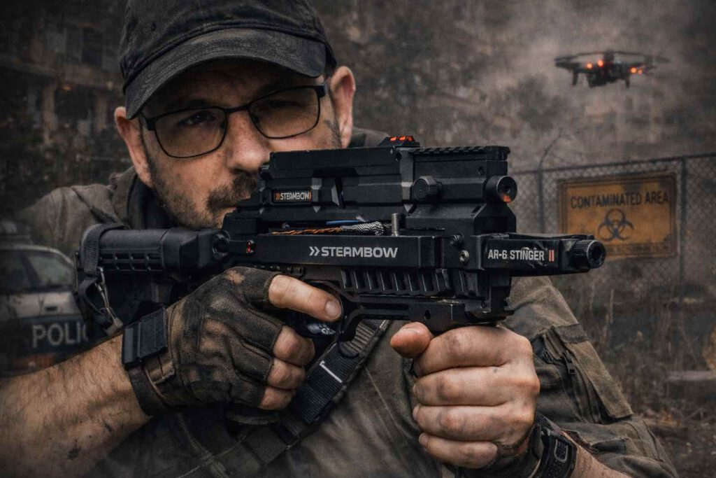 Auch diese Systeme sind mit vielfältigen Rail-Systemen ausgestattet und lassen sich umfangreich ausrüsten. Von Lampen über Laser bis hin zu Visieren ist die Bandbreite groß. Entsprechend steigt ihre Beliebtheit, und durch das einfache Handling stellen sie im Bereich taktischer Szenarien und der Heimverteidigung für Menschen ohne waffenrechtliche Erlaubnis eine Option im taktischen Bogenschießen dar.